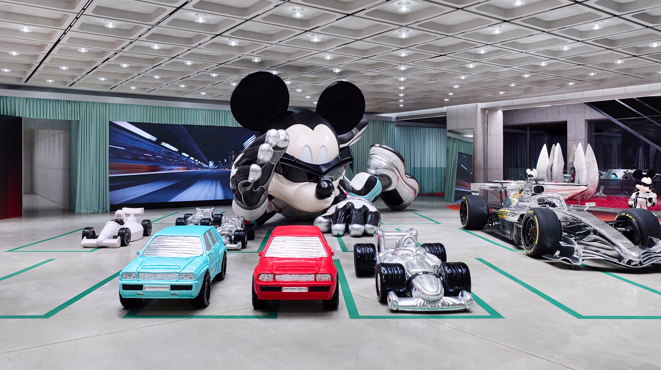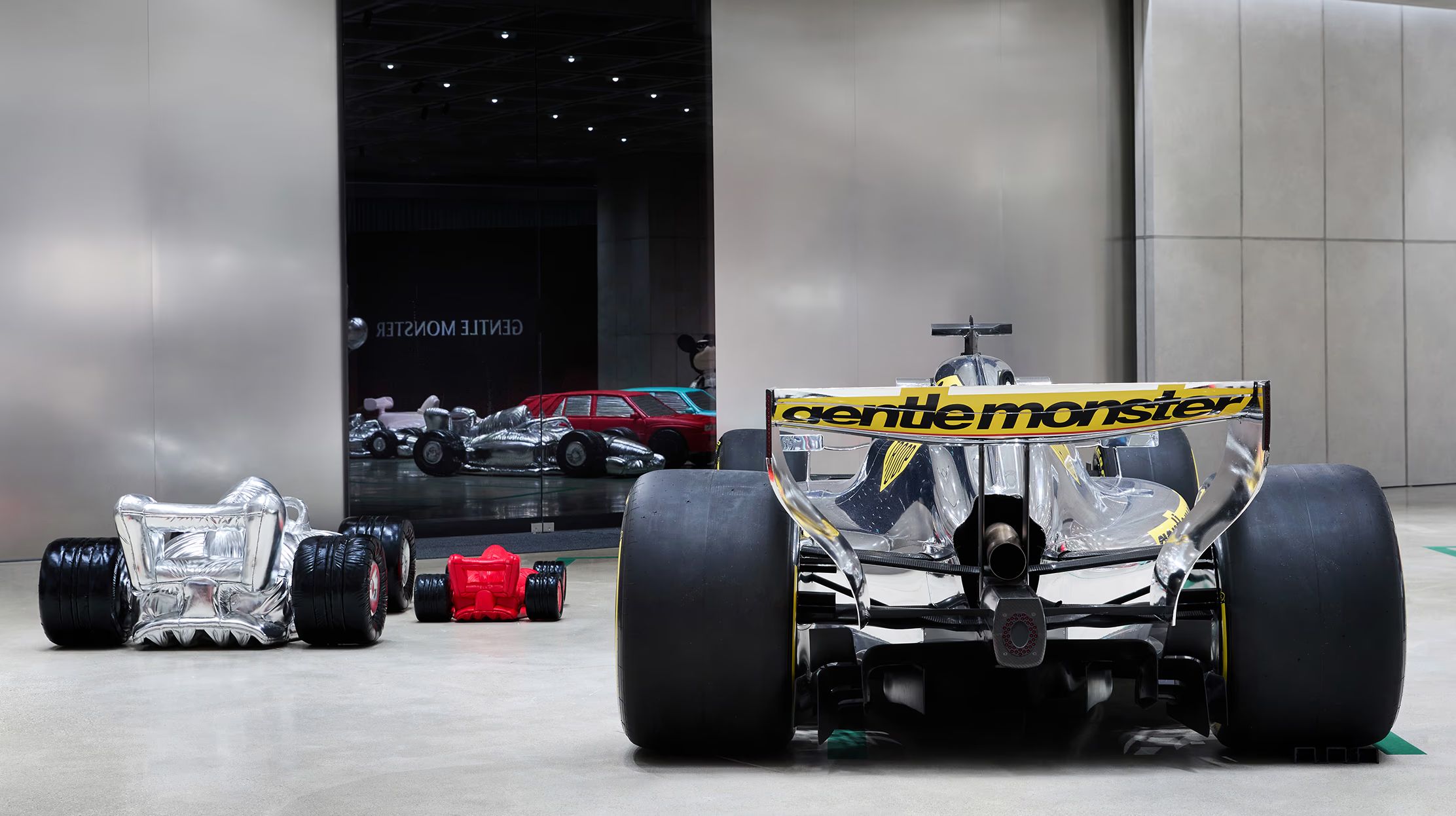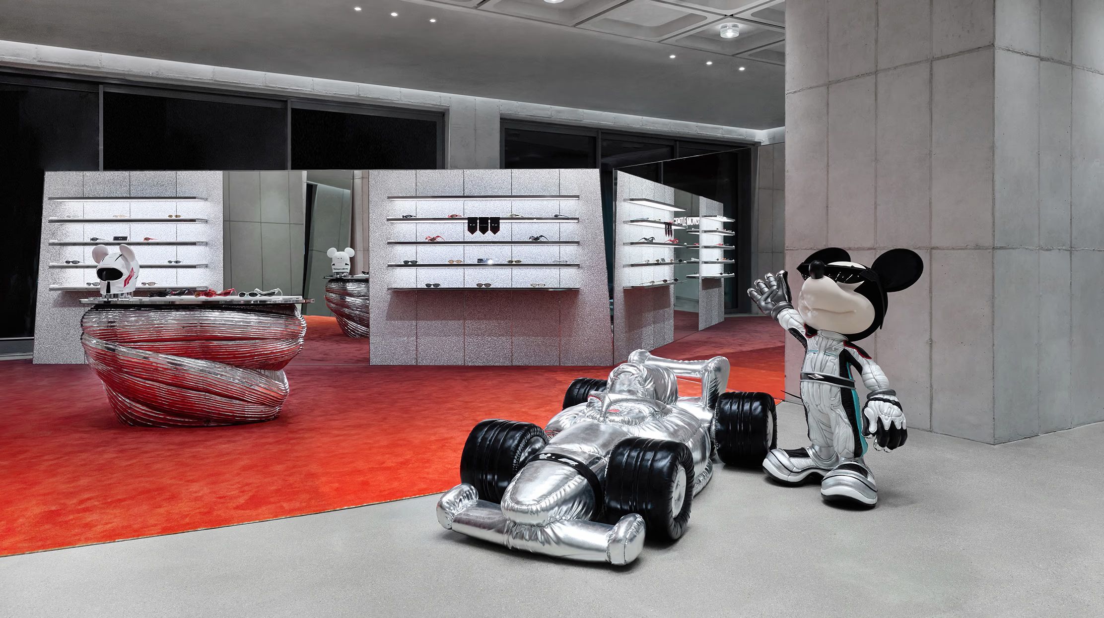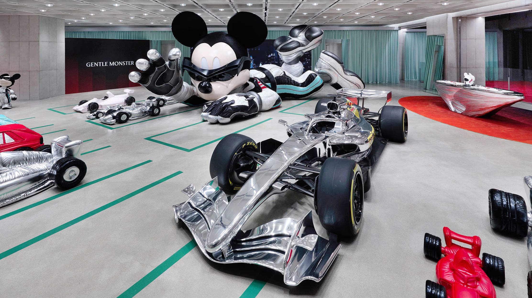성수 젠틀몬스터 플래그십 스토어 앞 외부 공간에 레이싱 수트를 입은 거대한 미키 마우스 오브제가 설치됐고, 매장 안에는 실제 F1 머신과 '2026 서킷 컬렉션'이 전시됐습니다. 도심 한복판에 들어선 미키 오브제가 SNS 인증샷 명소로 급속도로 입소문이 났습니다.