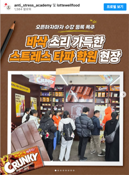 롯데웰푸드의 스테디셀러 초콜릿 브랜드 크런키가 2월 24일부터 3월 9일까지 서울 강남구 대치동 학원가에 '크런키 스트레스 타파 학원' 팝업스토어를 운영했습니다. 팝업스토어는 브랜드 모델 코미디언 이수지의 부캐릭터를 활용해 꾸며졌으며, 다양한 체험형 콘텐츠들을 총 3교시 콘셉트로 구성했습니다.