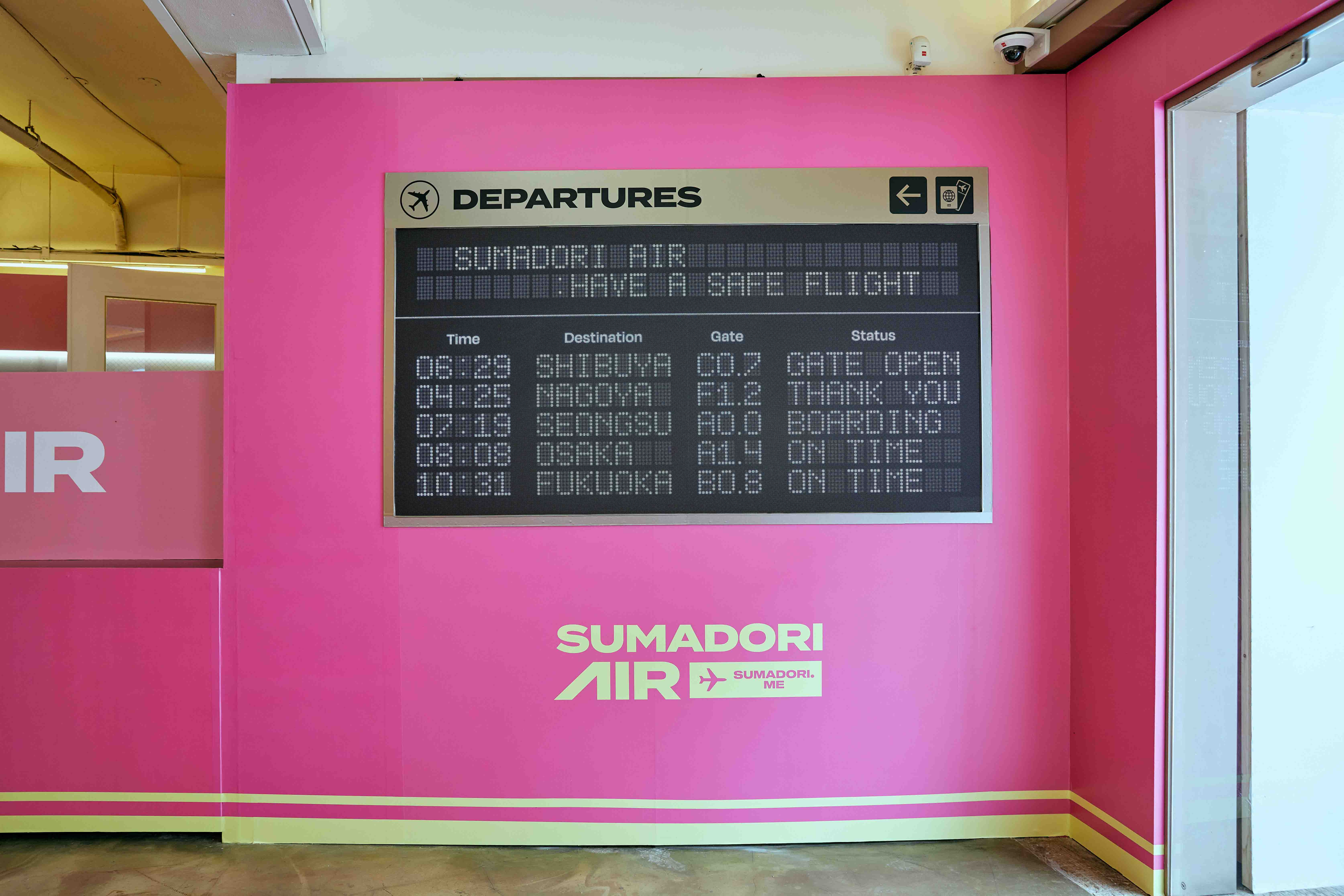 스마도리 바 팝업에서 '개성을 발견하는 여행'을 컨셉으로 공항 모티브의 2층 규모의 체험 공간 디자인을 선보였습니다. 비행기 티켓 모티브 외관과 LED 전광판, 체크인 카운터 등 포토제닉 요소로 브랜드 컨셉을 시각화했으며, 1층 체크인 존에서 2층 스카이 라운지까지 자연스러운 동선으로 연결해 방문객의 몰입 경험을 높였습니다.
