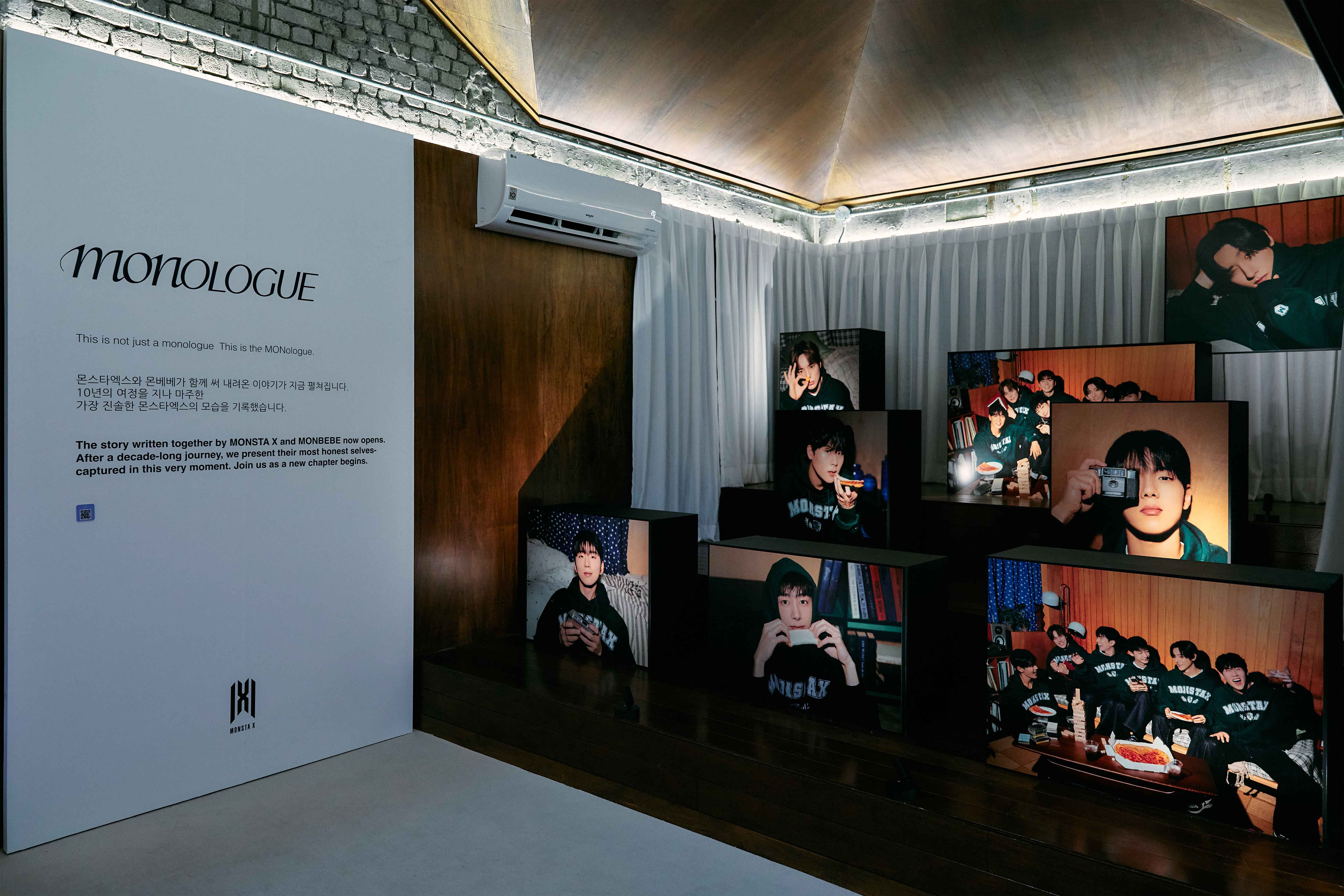 몬스타엑스와 팬들이 10년을 돌아보는 경험형 팝업으로, 주택형 스튜디오를 실제 집처럼 꾸며 몰입감을 높였습니다. 비밀의 방은 어두운 조도와 앤틱 소품, 손글씨 편지와 사진으로 추억을 공유하는 공간으로, 추억룸은 10년간의 앨범과 사진을 연대기처럼 전시, 소품룸은 멤버별 의상과 소품으로 개성을 살렸습니다. 전시룸은 새로운 사진을 볼 수 있는 공간으로 꾸몄습니다. 1층 거실은 굿즈와 LP 턴테이블을 전시하고, 2층 거실은 포토존과 10주년 기념 이벤트 공간으로 구성했습니다.